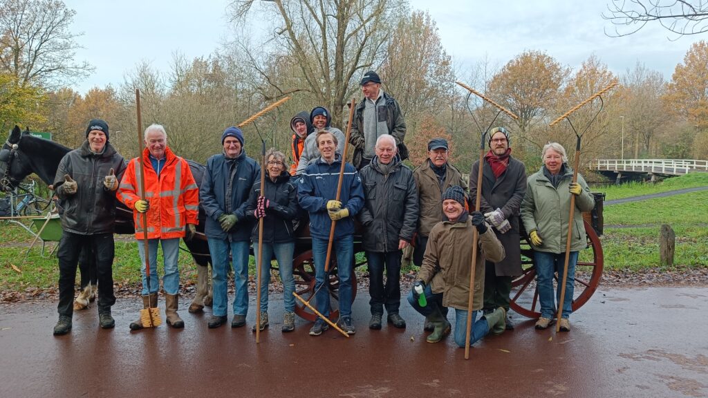 Vrijdag 22 november werden om 10 uur harken, kruiwagens en zakken verdeeld onder de vrijwilligers, en gingen we aan de slag om de paden in het noordelijk en oostelijk deel van het park van bladeren te ontdoen. Het verwijderen is nodig om gladheid te voorkomen en de paden begaanbaar te houden.
