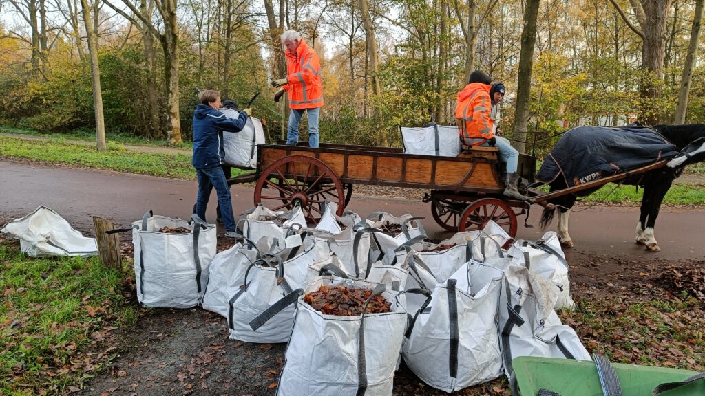 De vrijwilligers vullen de zakken met blad, die vervolgens door paar en wagen worden opgehaald en afgevoerd naar een ophaalplek op de Archimedeslaan.